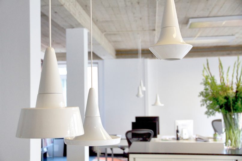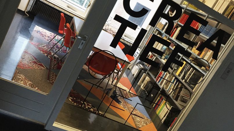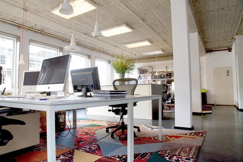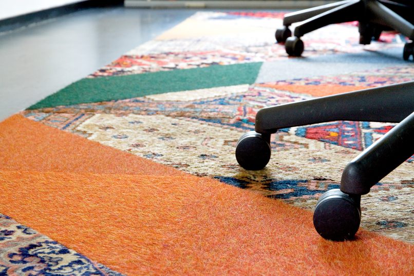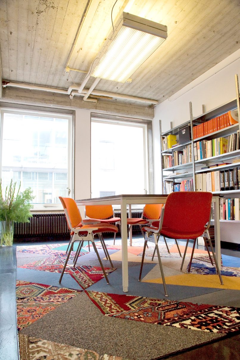 De ongedwongen sfeer en creativiteit is terug te zien in het interieur. Met bestickering op de ramen, gerecyclede vloerkleden en 2e hands meubilair is een fijne werkplek ontstaan.