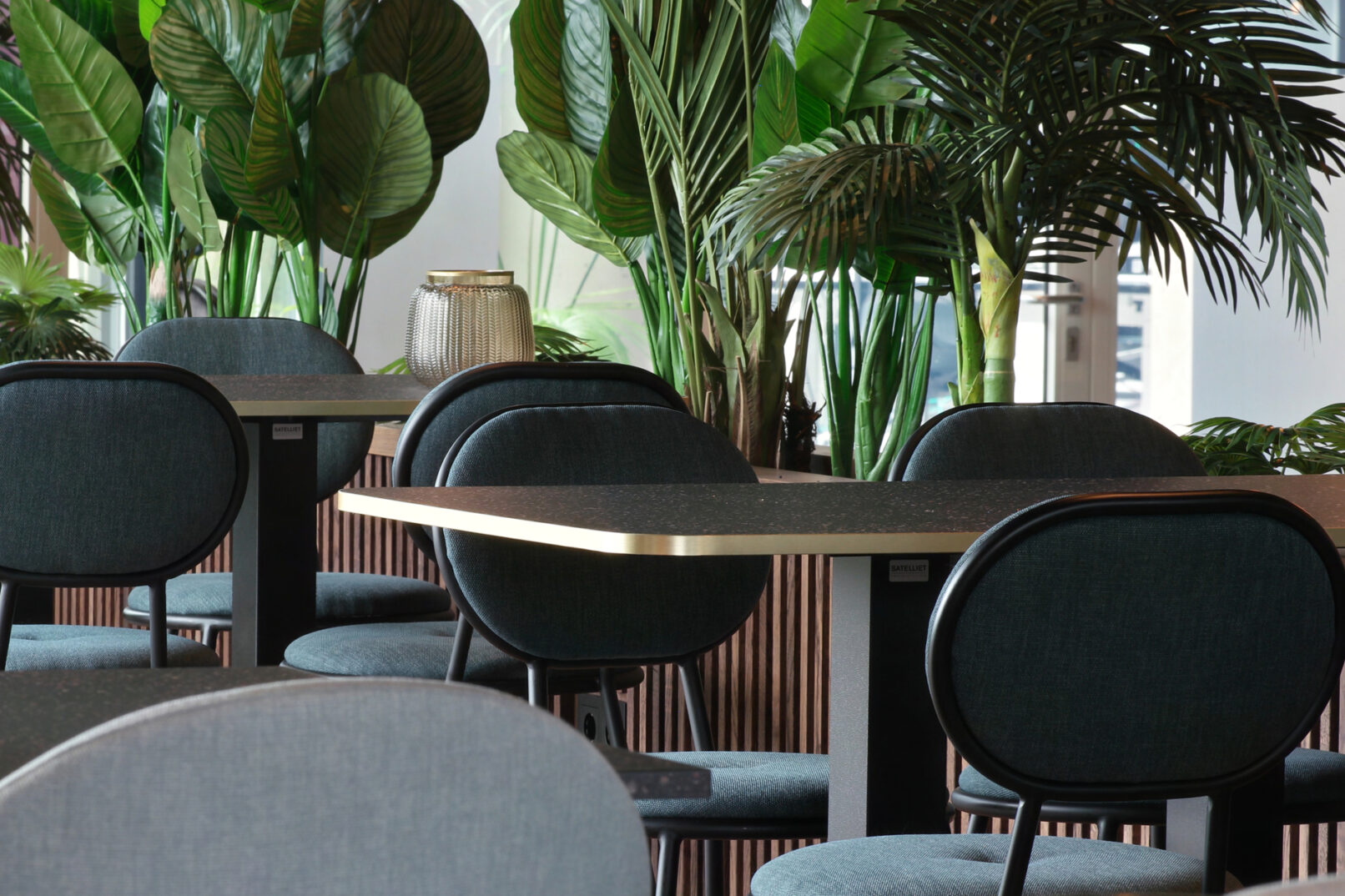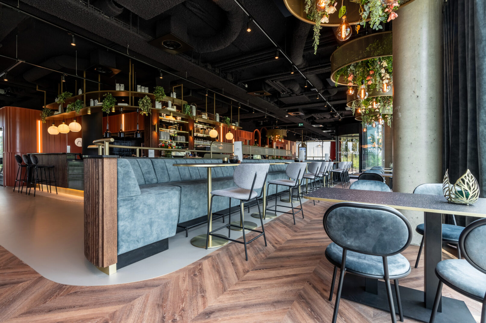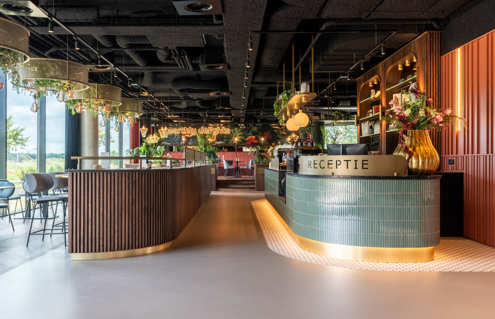 Op de begane grond van het multi-tenant kantoorgebouw Belvédère heeft Normaalkracht een warme en uitnodigende ontvangstruimte gecreëerd, perfect voor lunchen, vergaderen en sociale ontmoetingen. De inrichting kenmerkt zich door een luxe, warme en hoogwaardige uitstraling, met subtiele verwijzingen naar de jaren dertig en veertig. Centraal in de ruimte staat een lange, uitnodigende counter die direct in het oog springt. Een groot deel van de zitplekken is strategisch op een podium geplaatst, wat de dynamiek van de ruimte versterkt. Zorgvuldig geselecteerd meubilair, rijk kleurgebruik, elegante wandbekleding en houten latten accentueren de unieke identiteit van de ruimte en voegen een vleugje nostalgie toe.