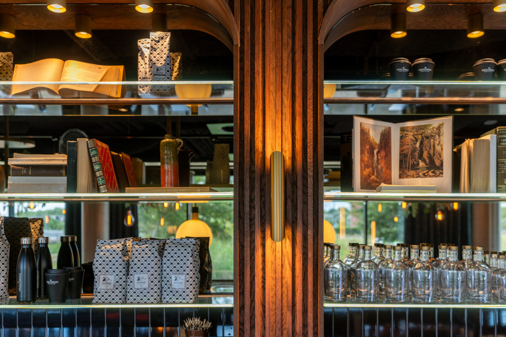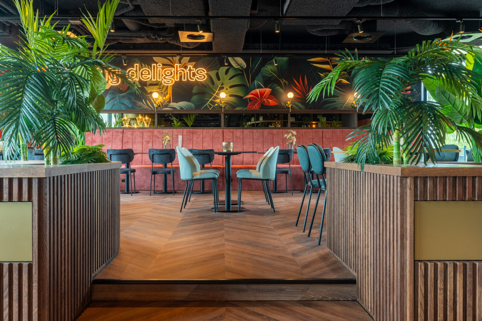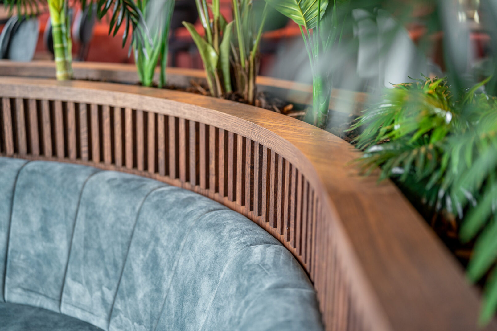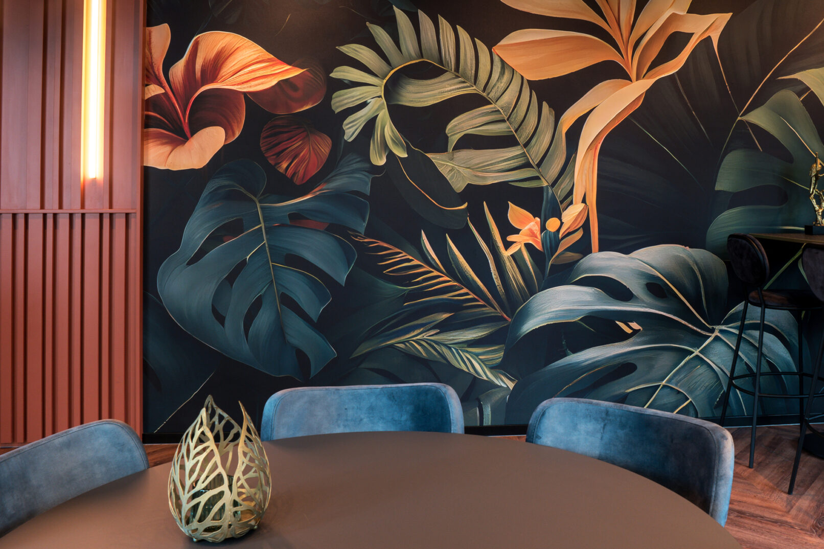 Op de begane grond van het multi-tenant kantoorgebouw Belvédère heeft Normaalkracht een warme en uitnodigende ontvangstruimte gecreëerd, perfect voor lunchen, vergaderen en sociale ontmoetingen. De inrichting kenmerkt zich door een luxe, warme en hoogwaardige uitstraling, met subtiele verwijzingen naar de jaren dertig en veertig. Centraal in de ruimte staat een lange, uitnodigende counter die direct in het oog springt. Een groot deel van de zitplekken is strategisch op een podium geplaatst, wat de dynamiek van de ruimte versterkt. Zorgvuldig geselecteerd meubilair, rijk kleurgebruik, elegante wandbekleding en houten latten accentueren de unieke identiteit van de ruimte en voegen een vleugje nostalgie toe.