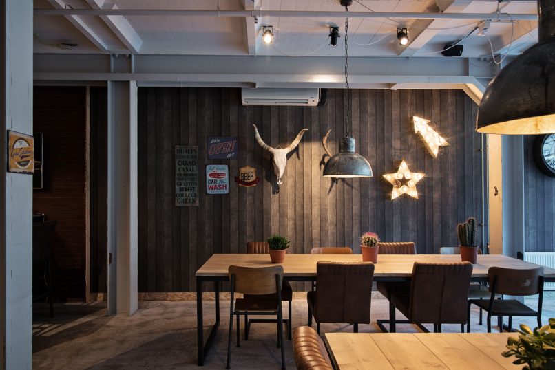 Normaalkracht heeft gezocht naar een mooie mix van herenclub en klassieke Amerikaanse bar. Een plek waar wordt gegamed, geluncht, geborreld, lekker gedraaid aan de DJ-booth, en voetbal gekeken in de avonduren. Een comfortabele plek om klanten zoals “Linda” en “VTwonen” op een mooie manier te ontvangen.